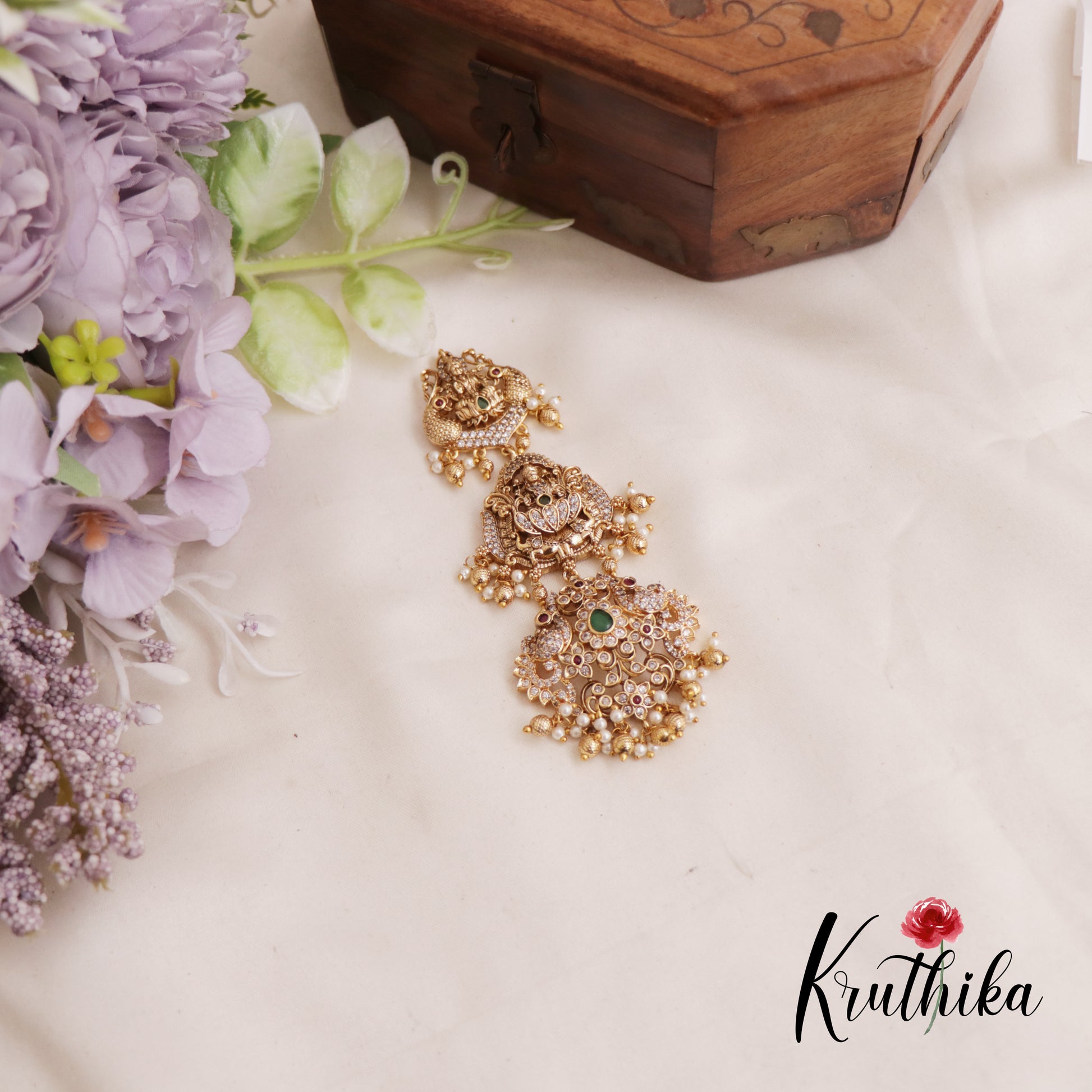 This beautiful Temple style Jada Billa set a three tiered design crafted with an antique gold tone finish. Each medallion is intricately detailed with traditional Lakshmi motifs and accented with vibrant green emerald style stones and shimmering white zircons. The pieces are elegantly finished with delicate pearl clusters and gold bead drops, making it a perfect heirloom inspired choice for bridal hair styling or festive traditional attire.