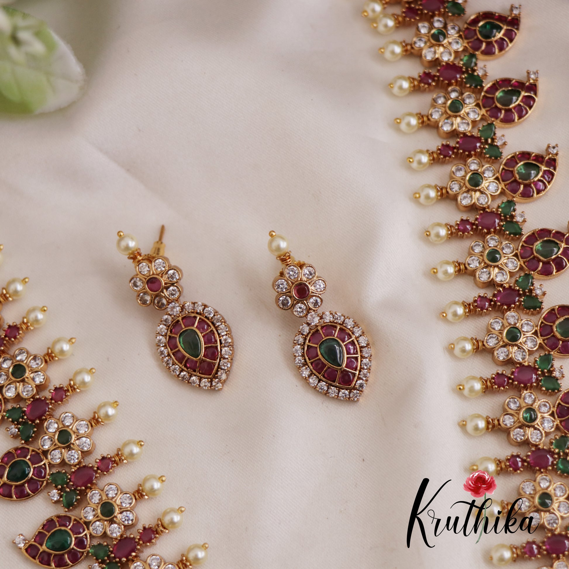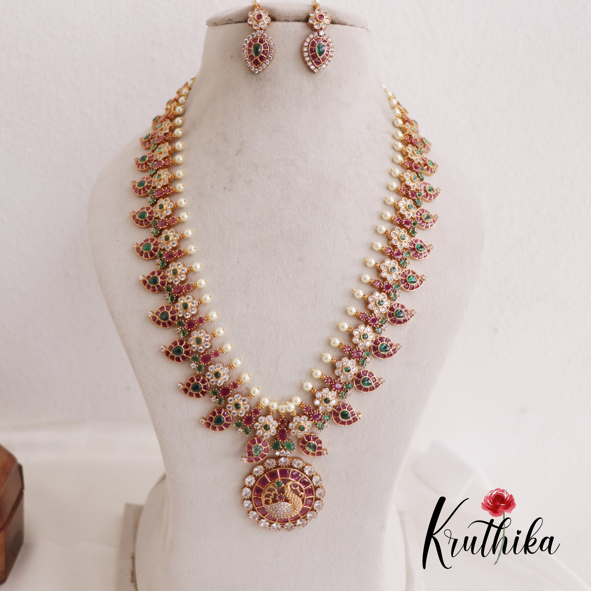 This elegant style jewelry set features a traditional South Indian aesthetic, blending timeless craftsmanship with regal charm. The haarm is designed with a series of intricate mango shaped motifs and delicate floral clusters, richly embellished with vibrant ruby stones and shimmering zircons. A grand circular peacock pendant serves as the centerpiece, suspended from a strand lined with soft cream pearls. Accompanied by matching teardrop earrings, this set is a perfect statement piece for weddings, festivals and ethnic wear.