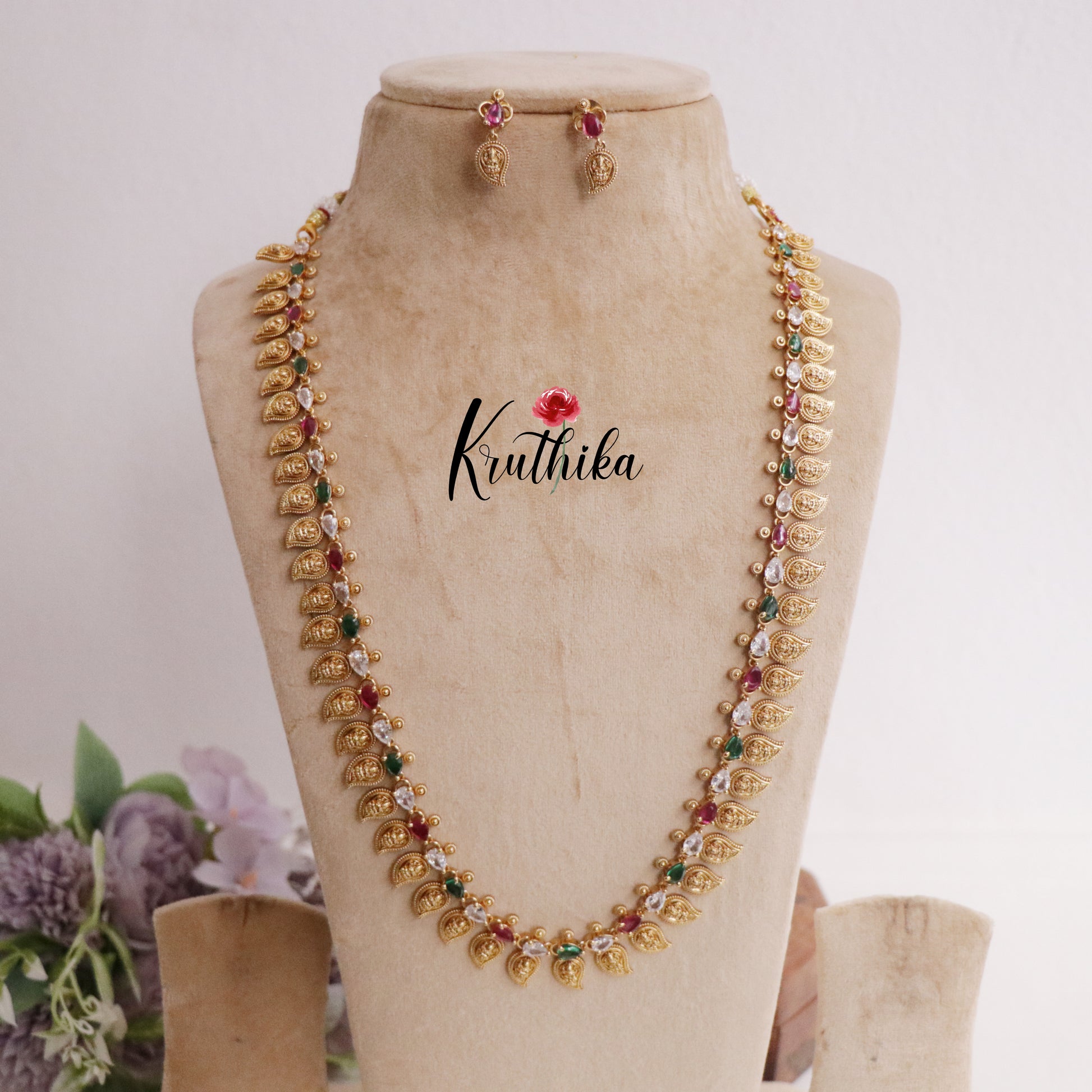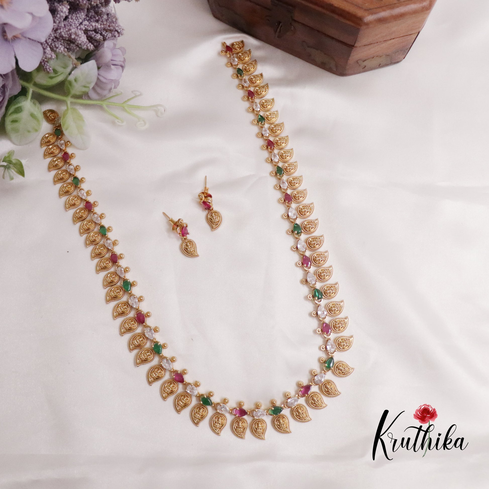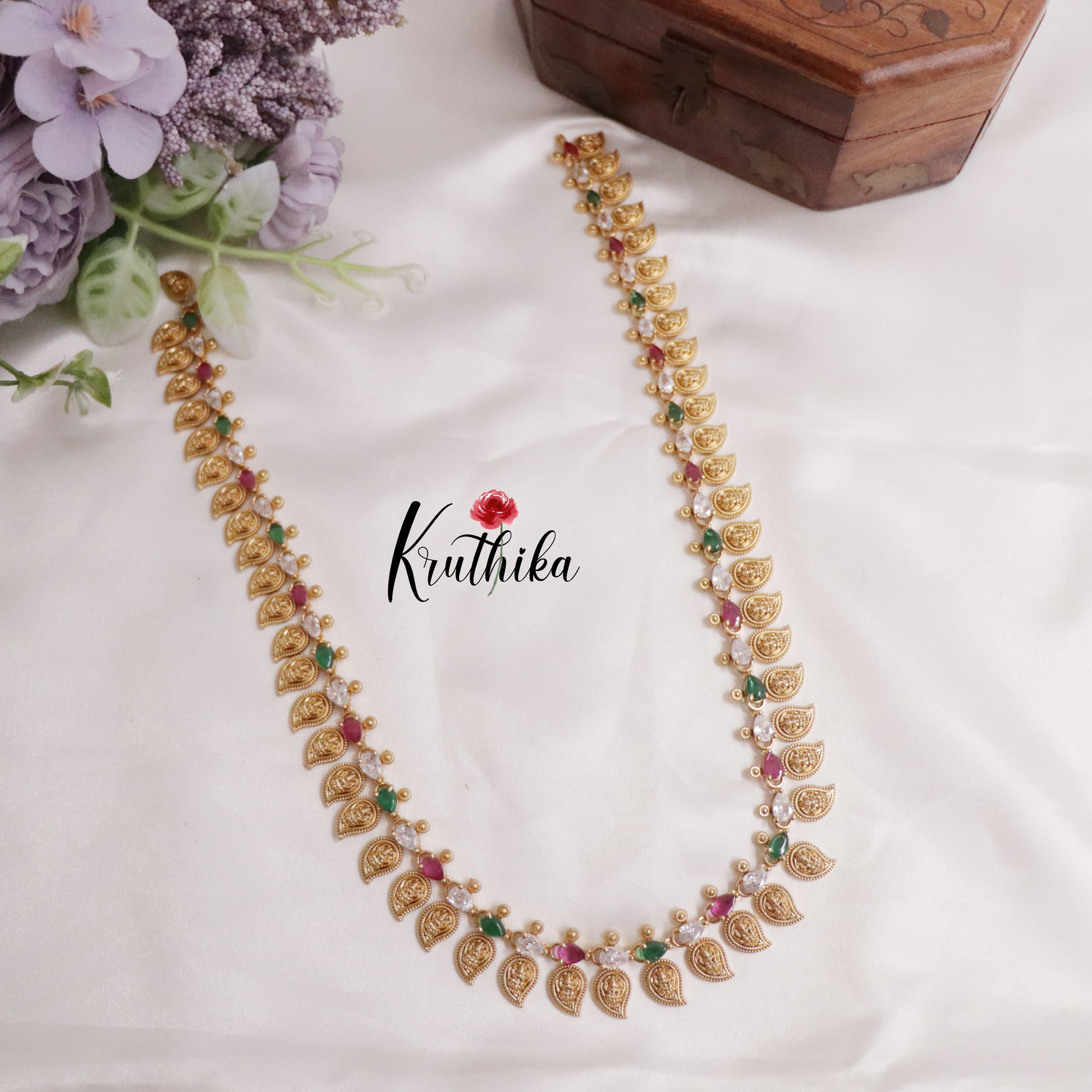 Enhance your style with our stunning, Trendy AD Manga Haaram Crafted with high-quality stones & beads, this set combines timeless elegance with a modern touch. Ideal for special occasions or adding a touch of glamour to your look.