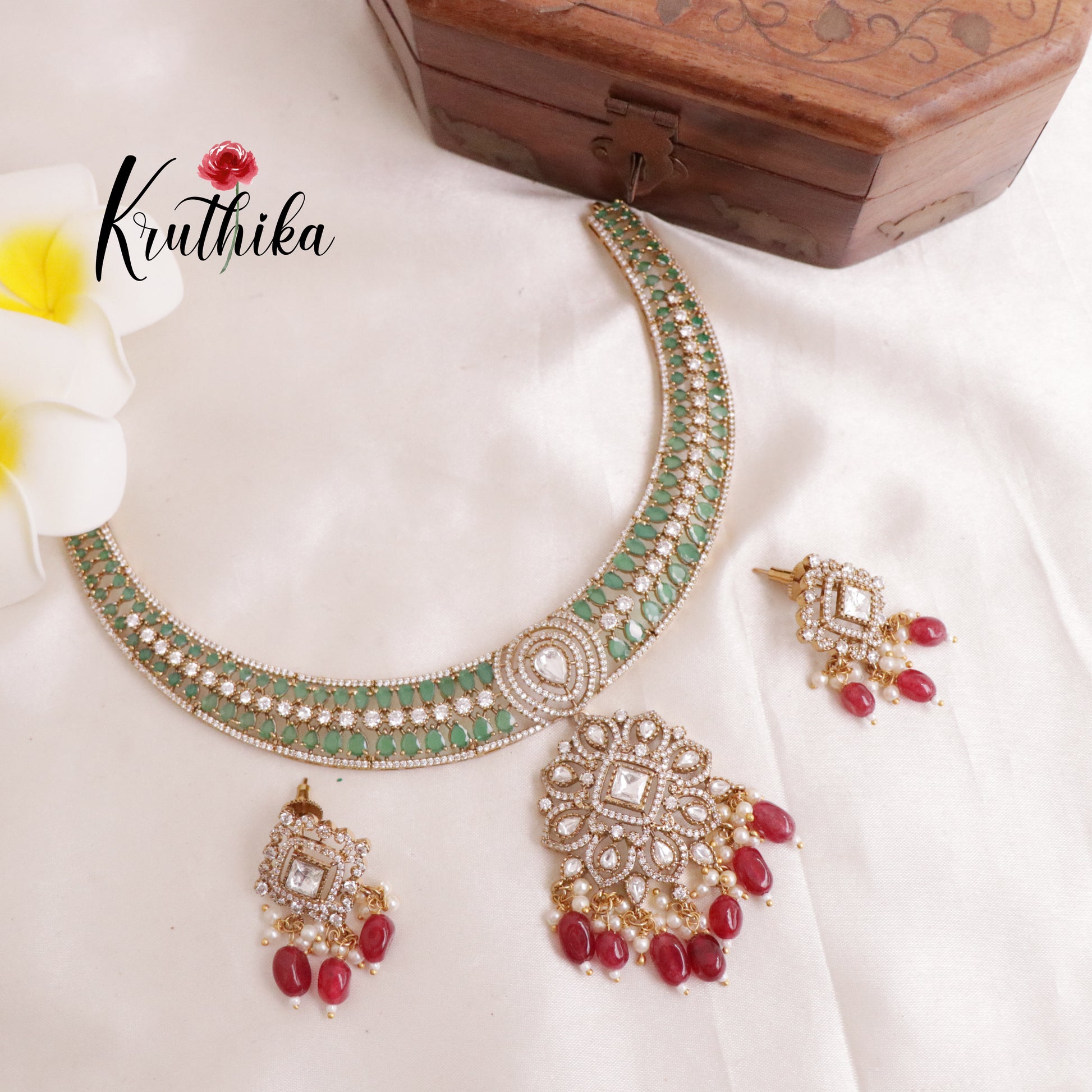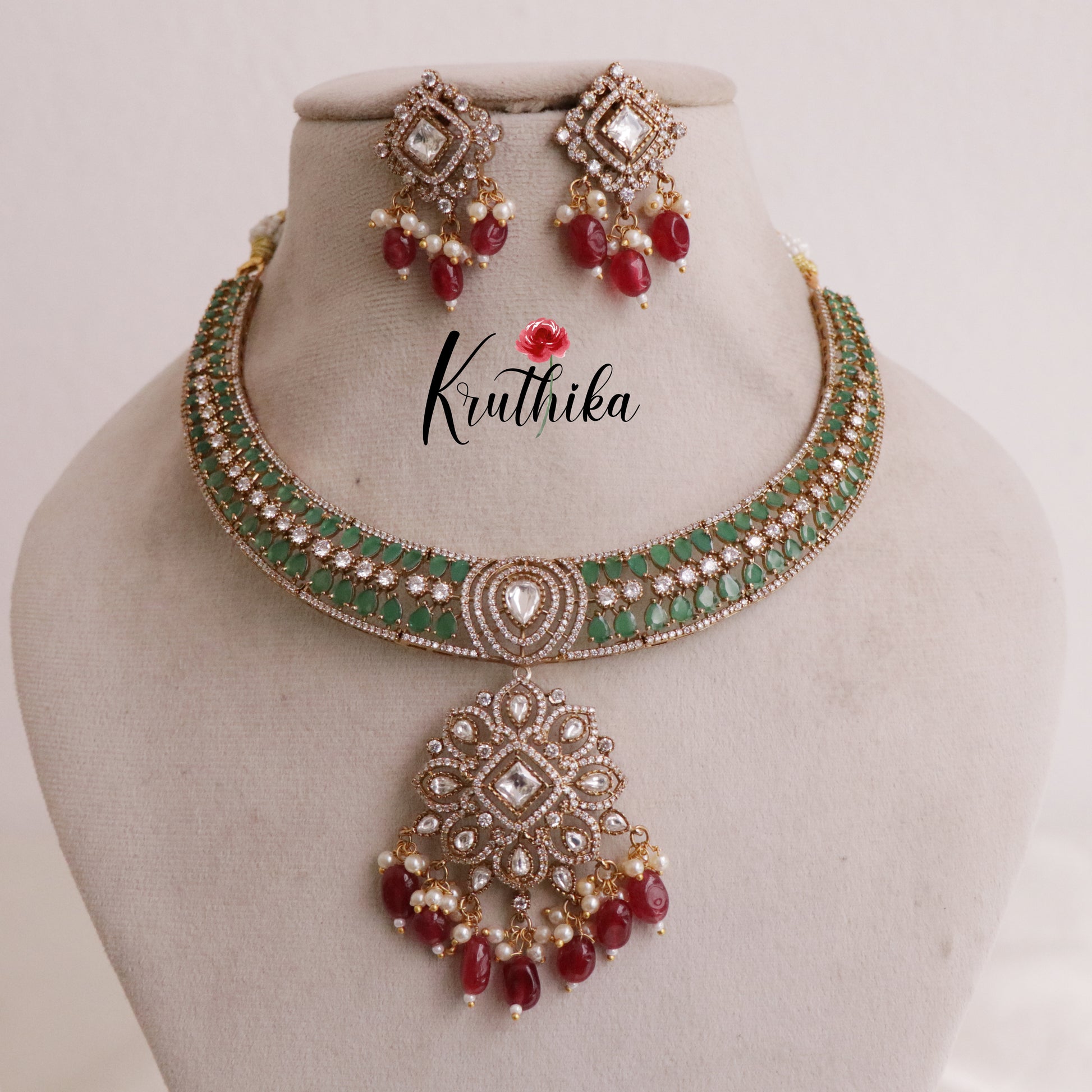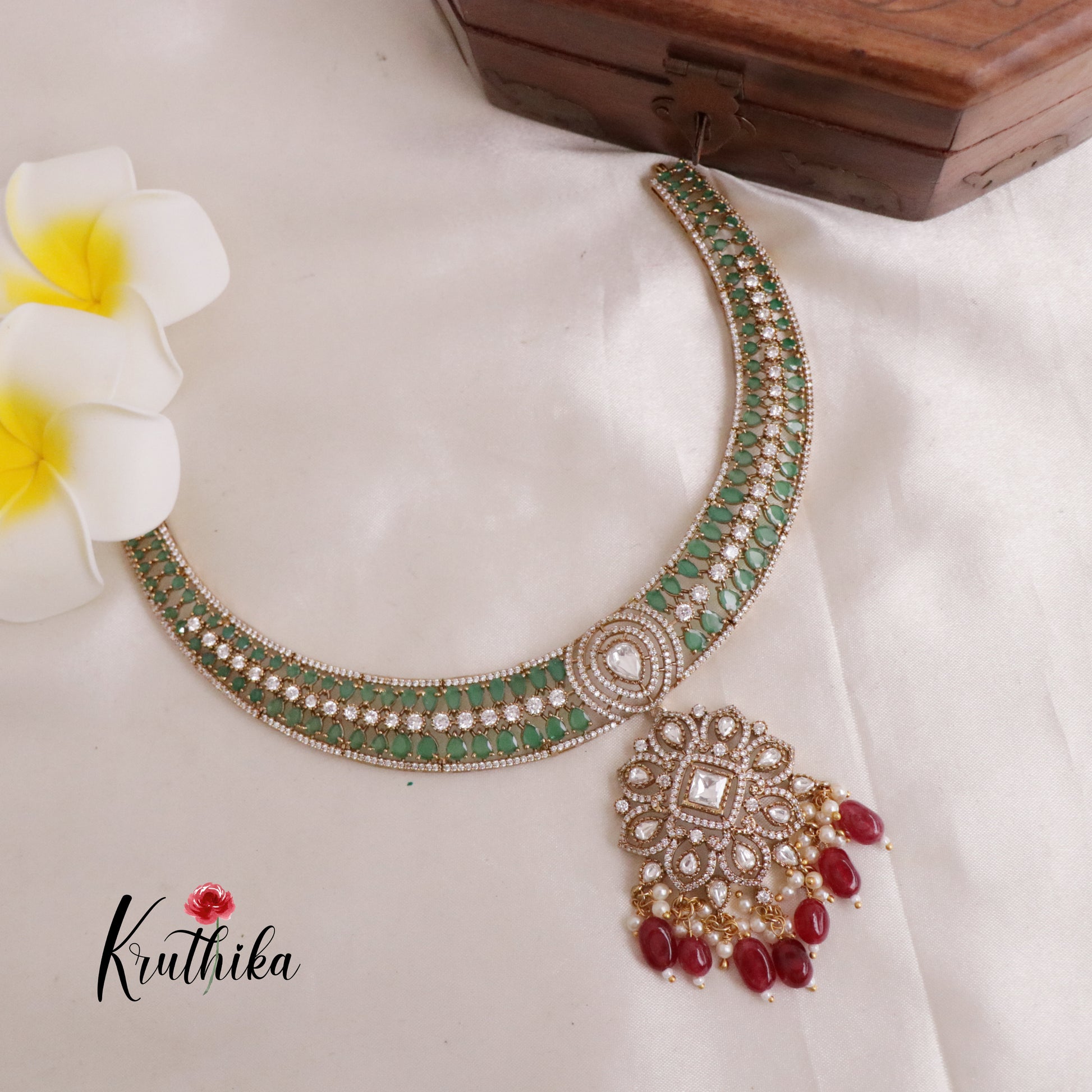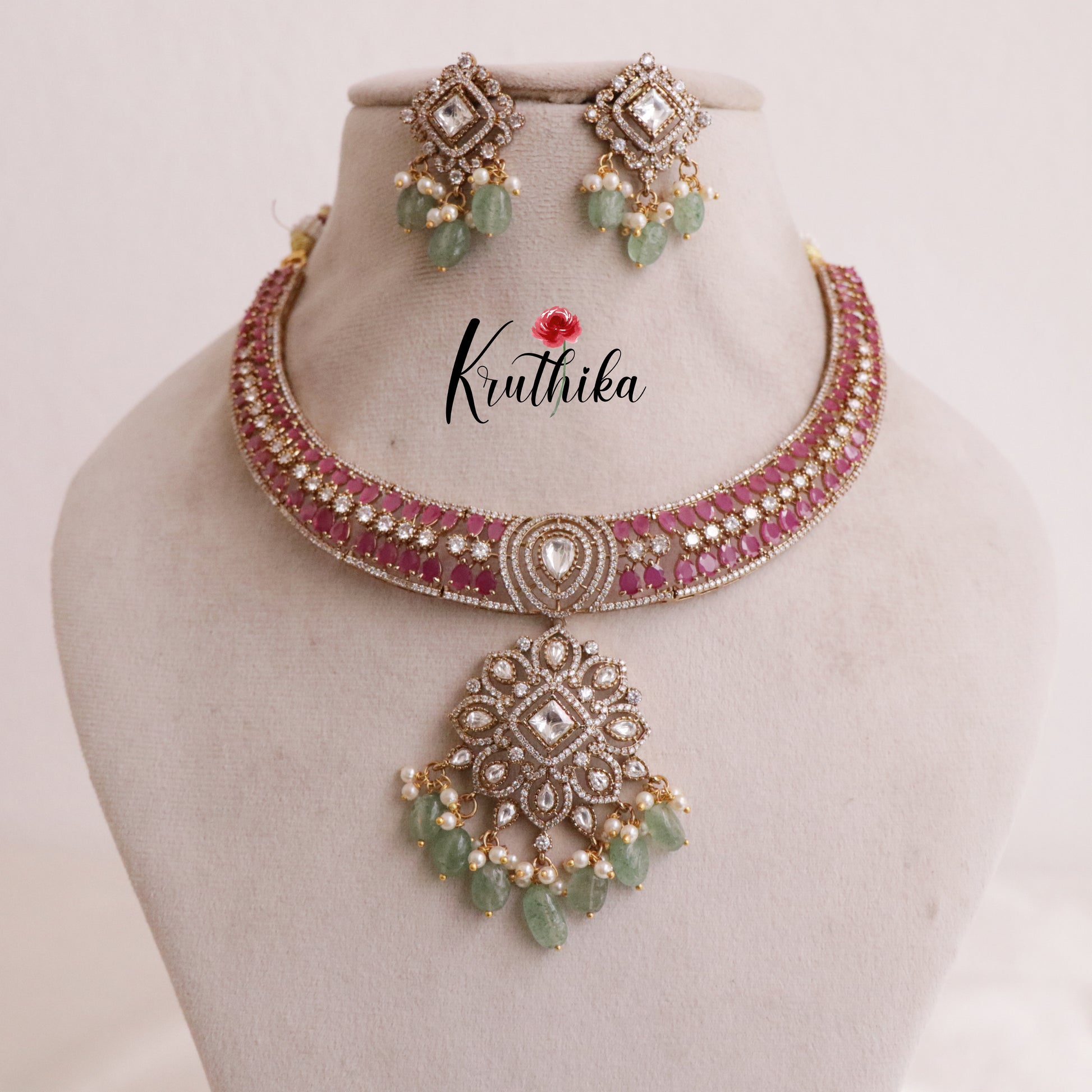 Enhance your style with our stunning , Trendy AD Victorian hasli necklace with bead drops. Crafted with high-quality stones & beads, this set combines timeless elegance with a modern touch. Ideal for special occasions or adding a touch of glamour to your look.