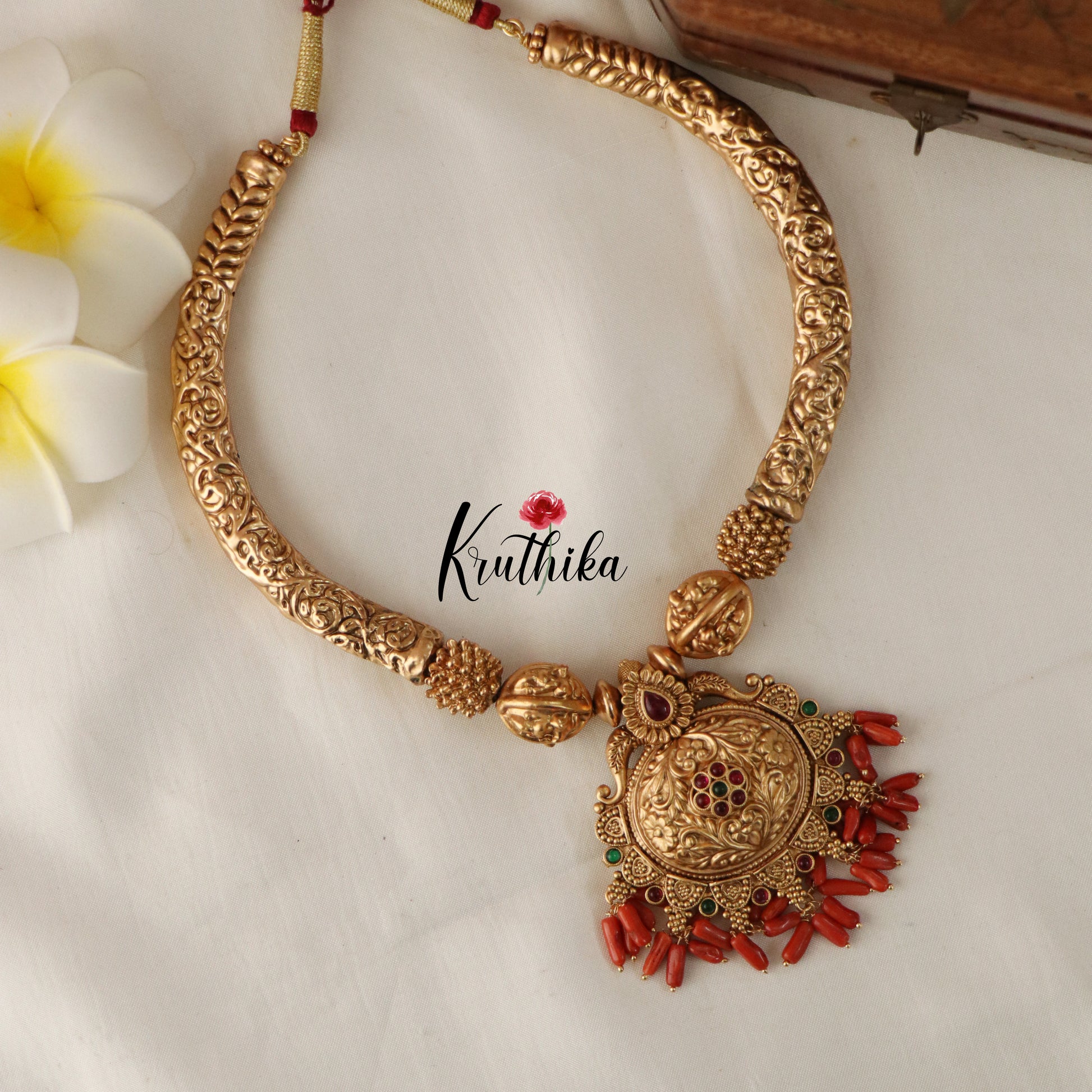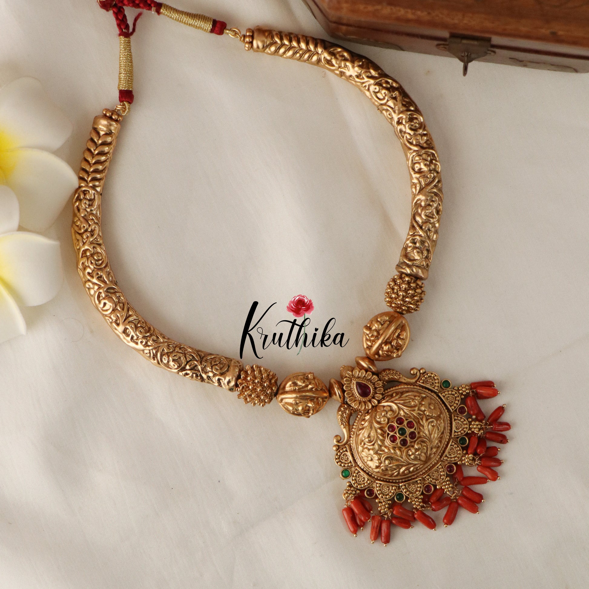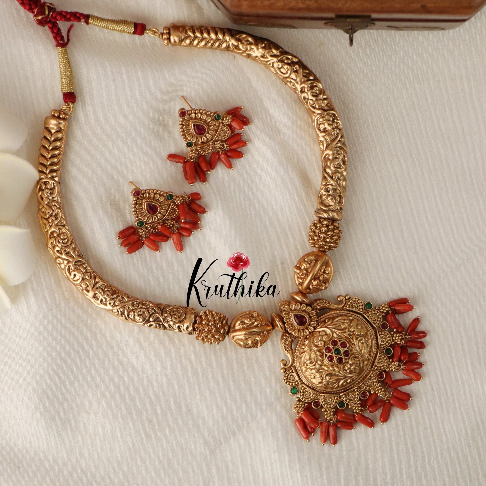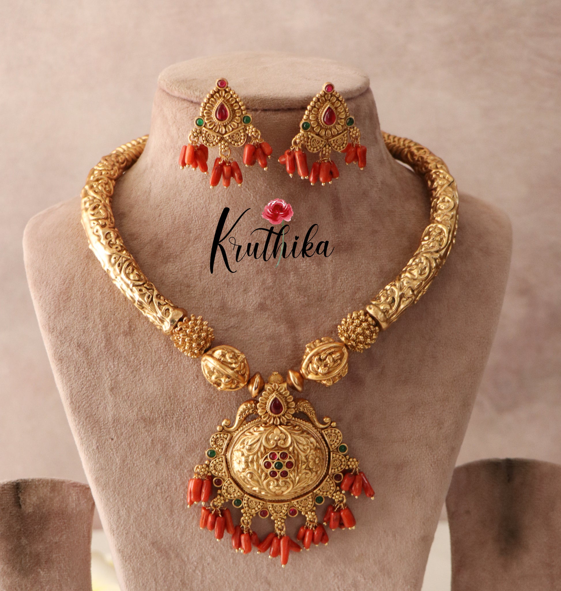 Enhance your style with our stunning, Trendy Antique Coral hasli Necklace Set Crafted with high-quality stones & beads, this set combines timeless elegance with a modern touch. Ideal for special occasions or adding a touch of glamour to your look.
