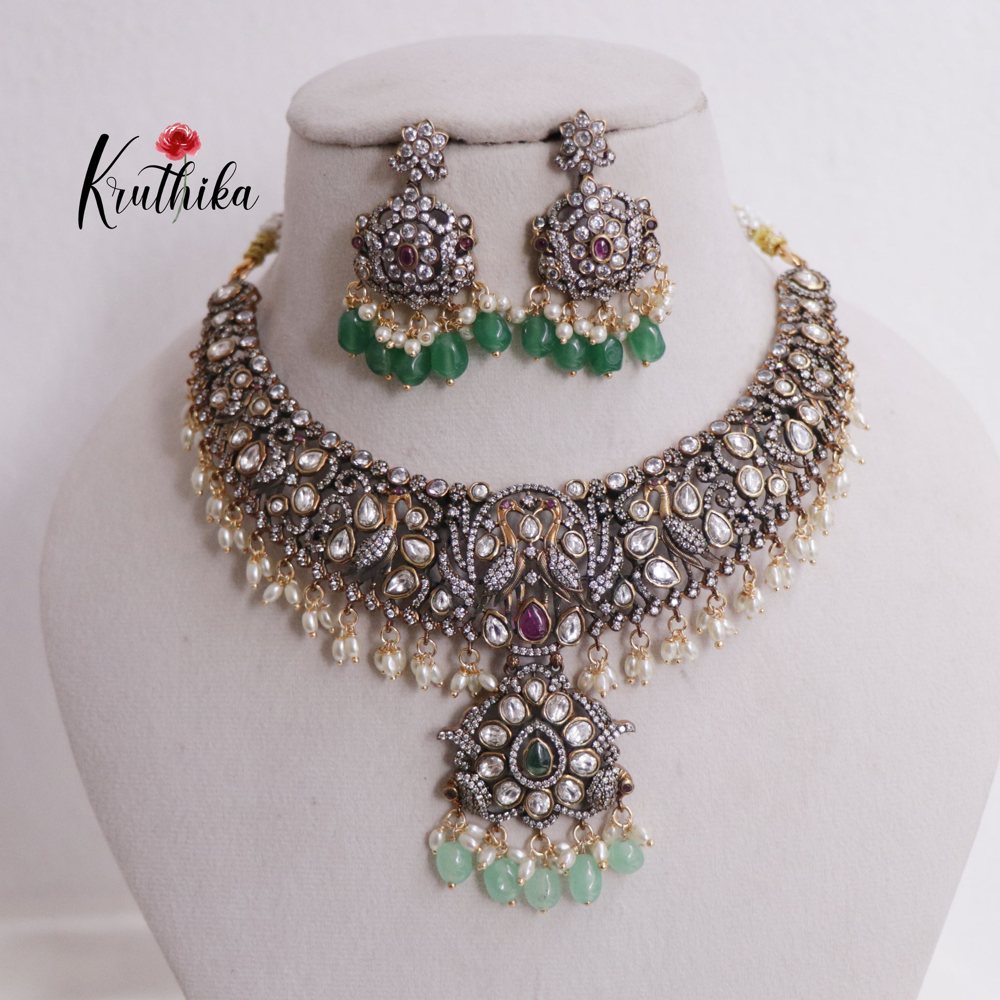 Enhance your style with our stunning Trendy Antique Victorian Finish Kundan Peacock Necklace paired perfectly with matching earrings. Crafted with high-quality stones & beads, this set combines timeless elegance with a modern touch. Ideal for special occasions or adding a touch of glamour to your look.