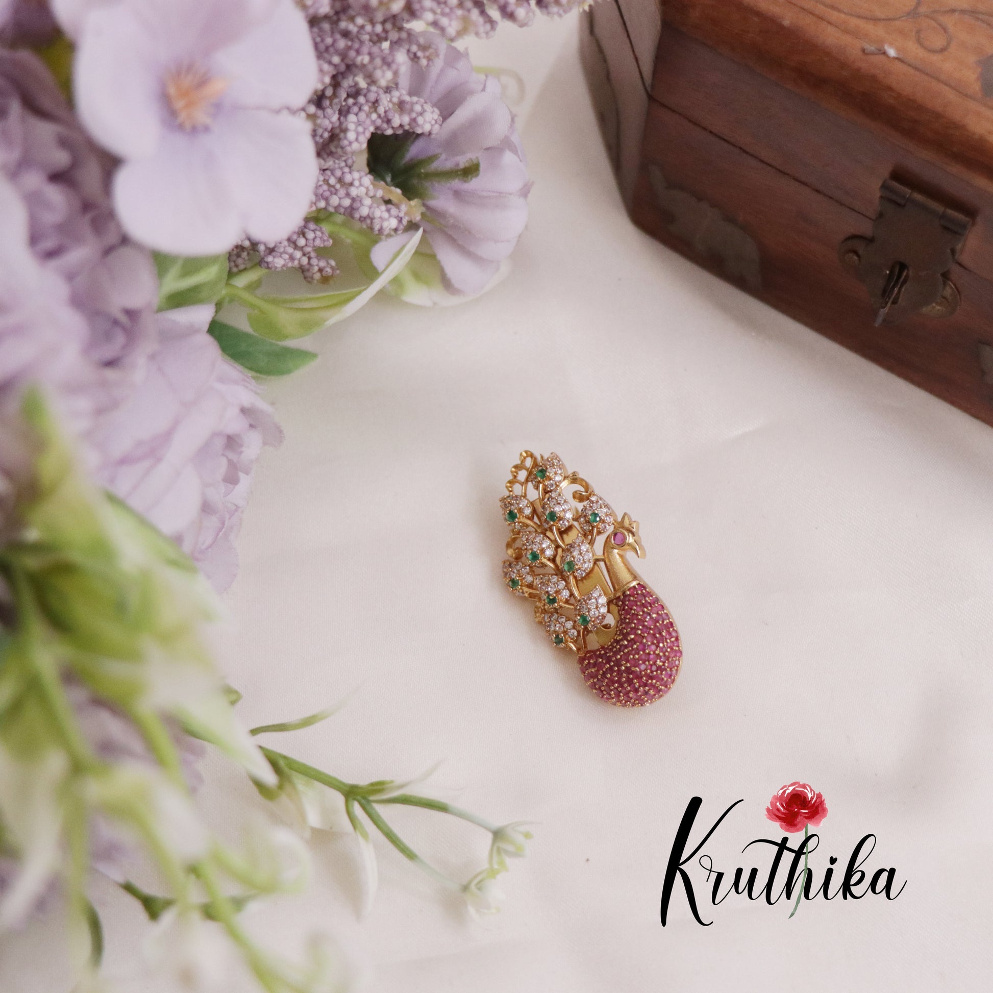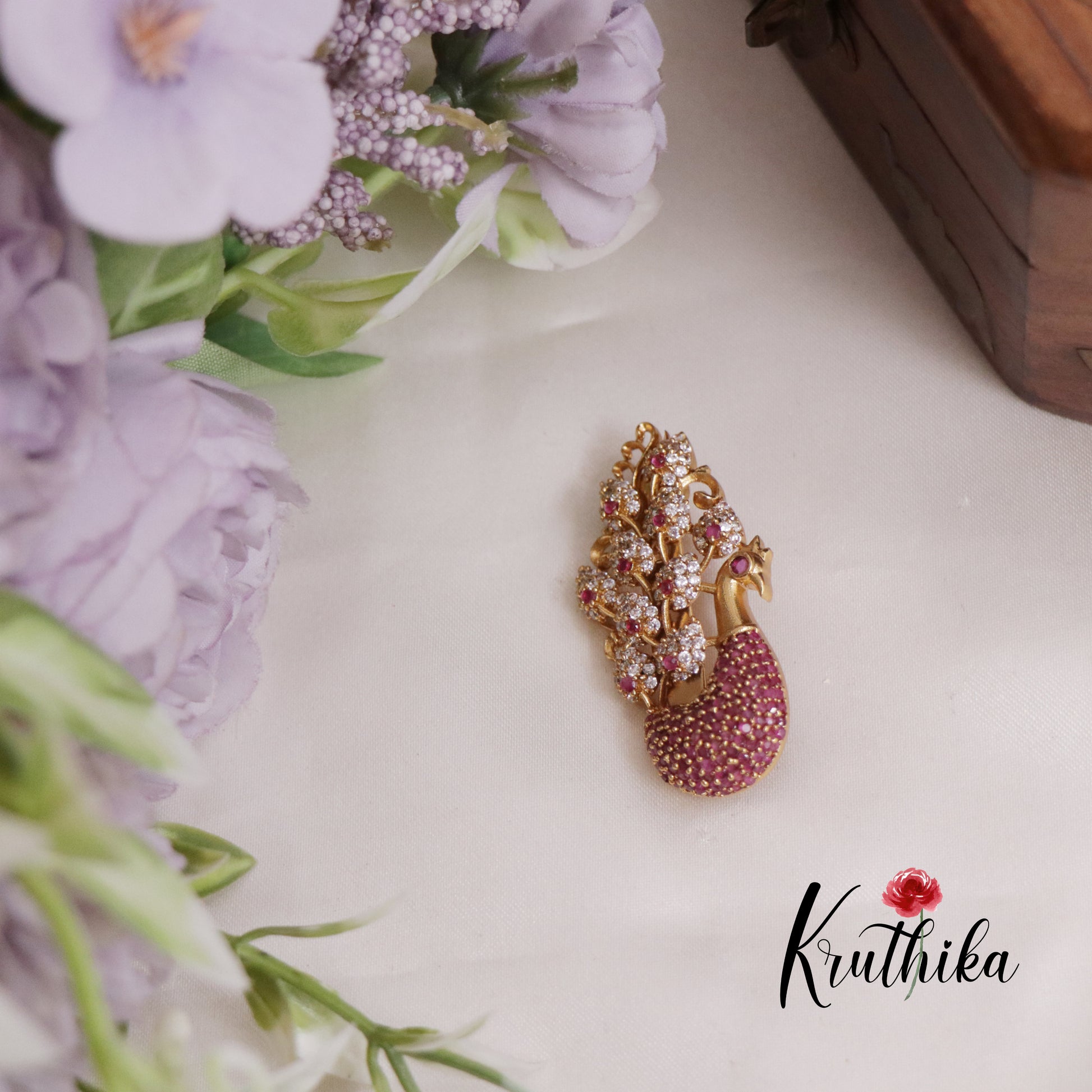 Enhance your traditional saree drape with this exquisitely crafted Lakshmi saree pin, symbolising prosperity and grace. Designed with an antique gold-tone finish, the pin features intricate deity detailing adorned with sparkling CZ stones and rich ruby-green accents. Perfect for weddings, poojas, and festive occasions, this saree pin adds a divine touch while providing a secure and elegant hold.