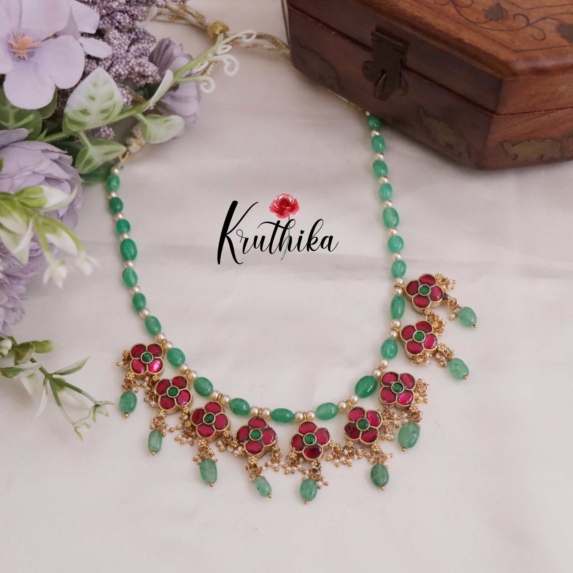 Enhance your style with our stunning Trendy Emerald Beaded Two-in-One Reversible Floral Jadau Necklace with Beads Drops paired perfectly with matching earrings. Crafted with high-quality stones & beads, this set combines timeless elegance with a modern touch. Ideal for special occasions or adding a touch of glamour to your look.