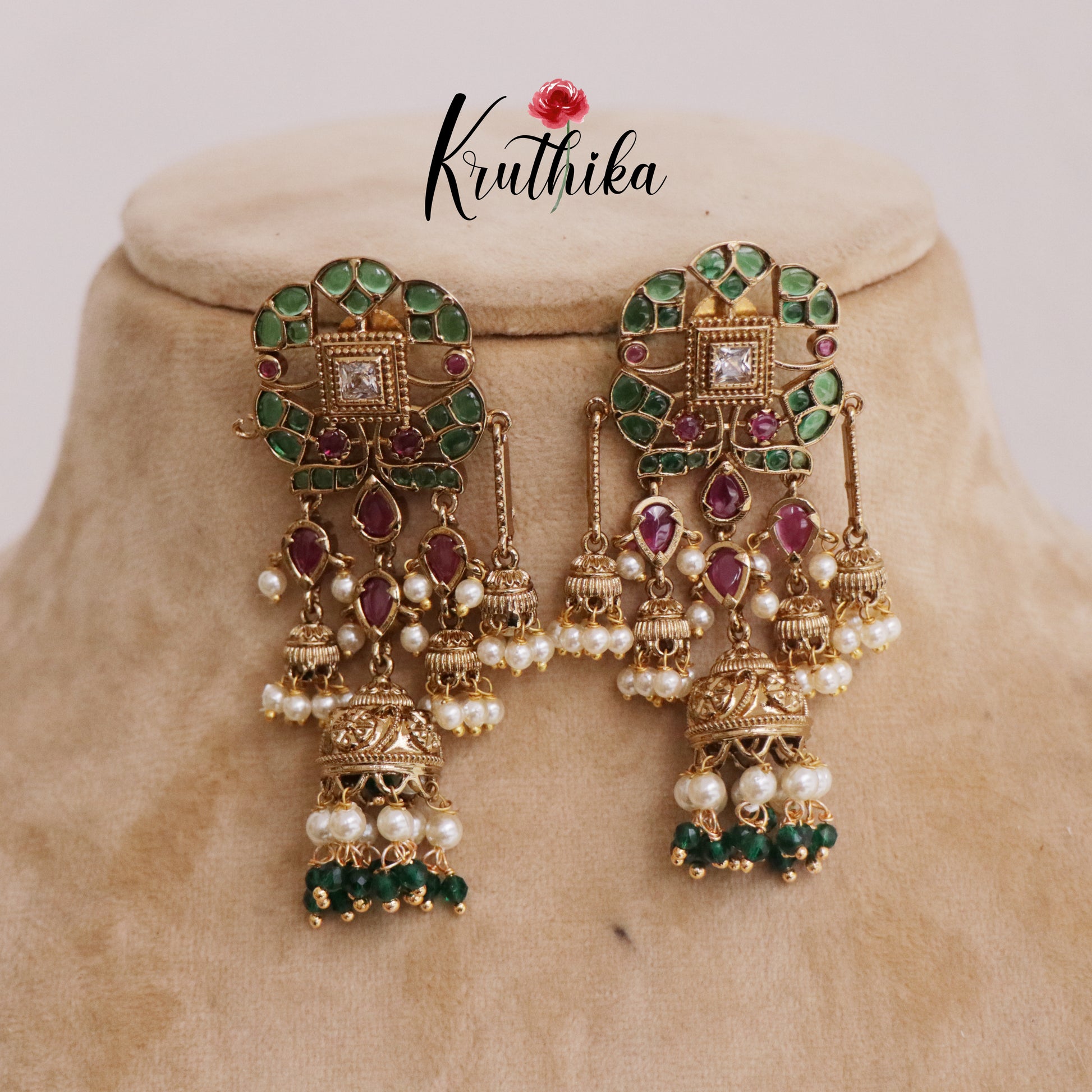 Elevate your ethnic ensemble with these exquisite Jhumkas, masterfully crafted to capture timeless elegance. Featuring a harmonious blend of lustrous emeralds and deep rubies set in intricate traditional design, these earrings showcase the artistry of fine jewelry making. The delicate pearl drops add a refined luminescence, creating a sophisticated interplay of gemstones that catches light beautifully. Perfect for festive occasions, weddings, or special celebrations, these jhumkas embody the grace of classical Indian jewelry craftsmanship. An investment piece that transcends trends, offering versatile styling for both traditional and contemporary occasions.