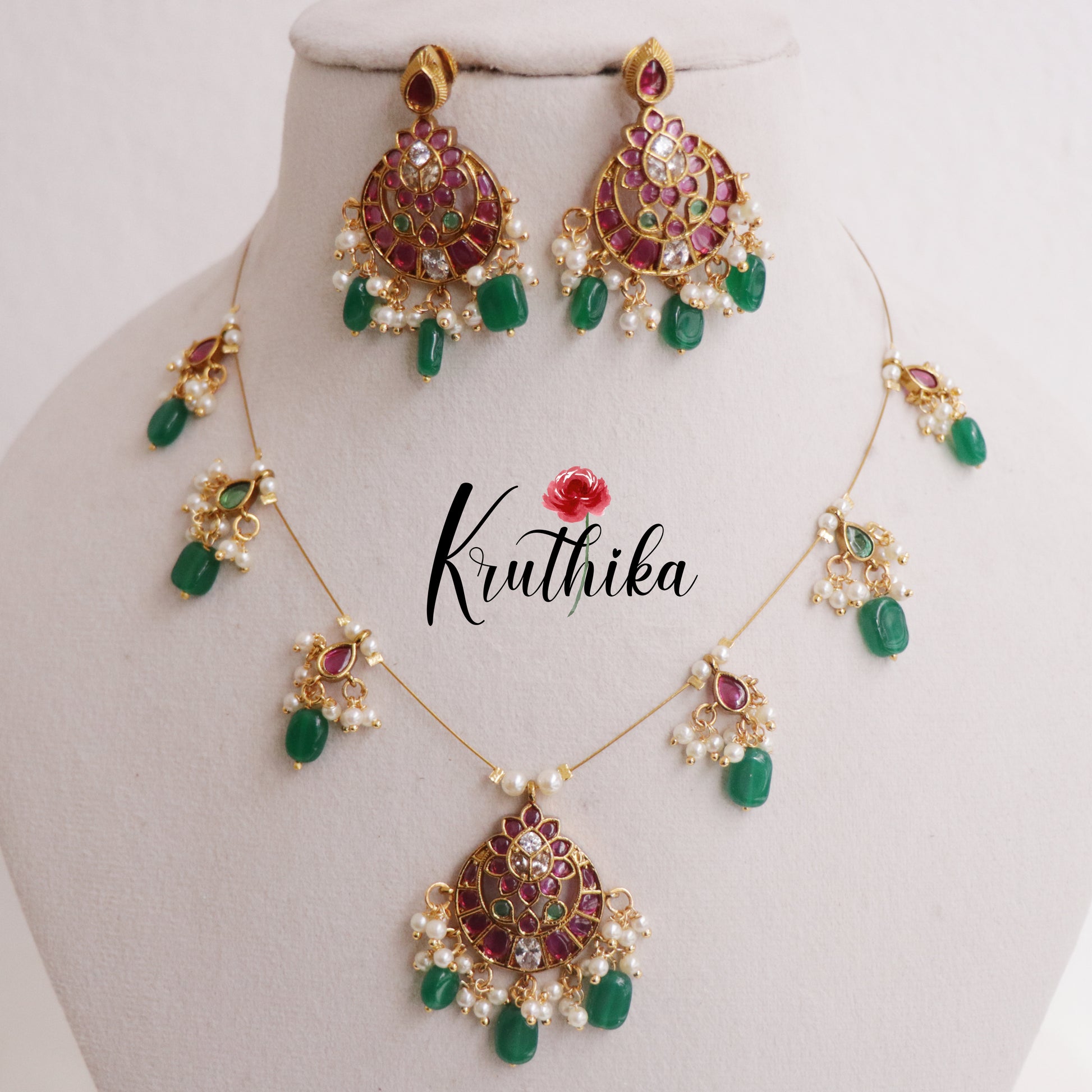 Elevate your ethnic ensemble with this striking Kemp Chandbali that commands attention. The invisible chain design creates an illusion of floating elegance, while vibrant green bead drops add a bold pop of color and movement. Crafted with traditional Kemp stone work, this piece merges timeless artistry with contemporary flair. Perfect for those who refuse to blend in—wear it to weddings, festivals, or whenever you want to make a fearless statement. A daring accessory that transforms any outfit into something unforgettable.