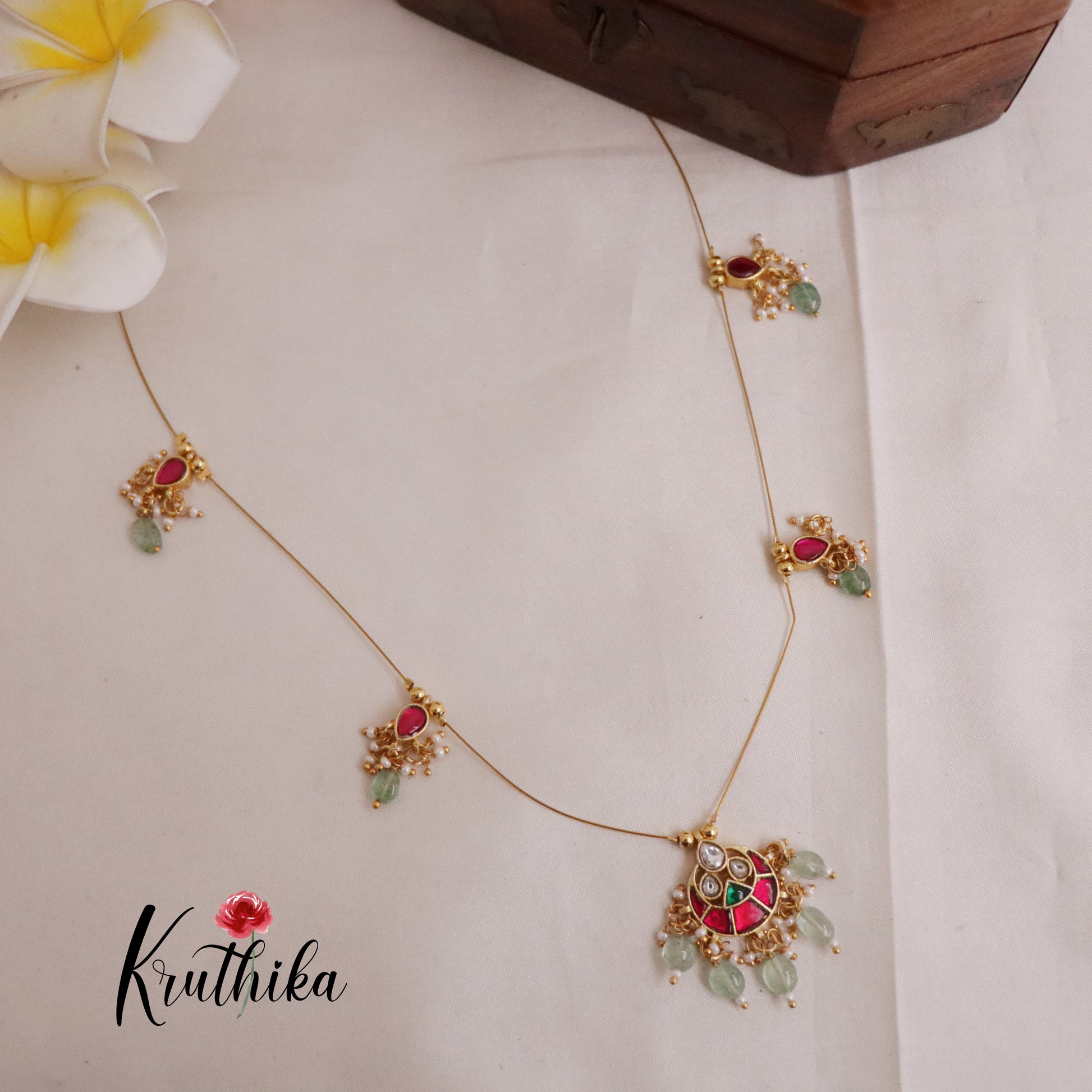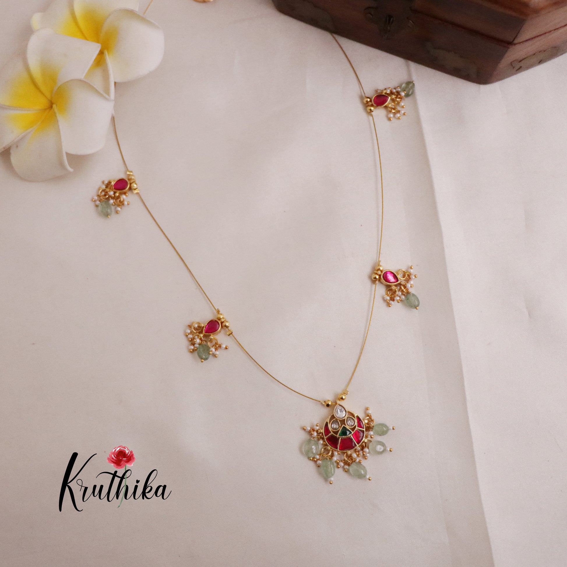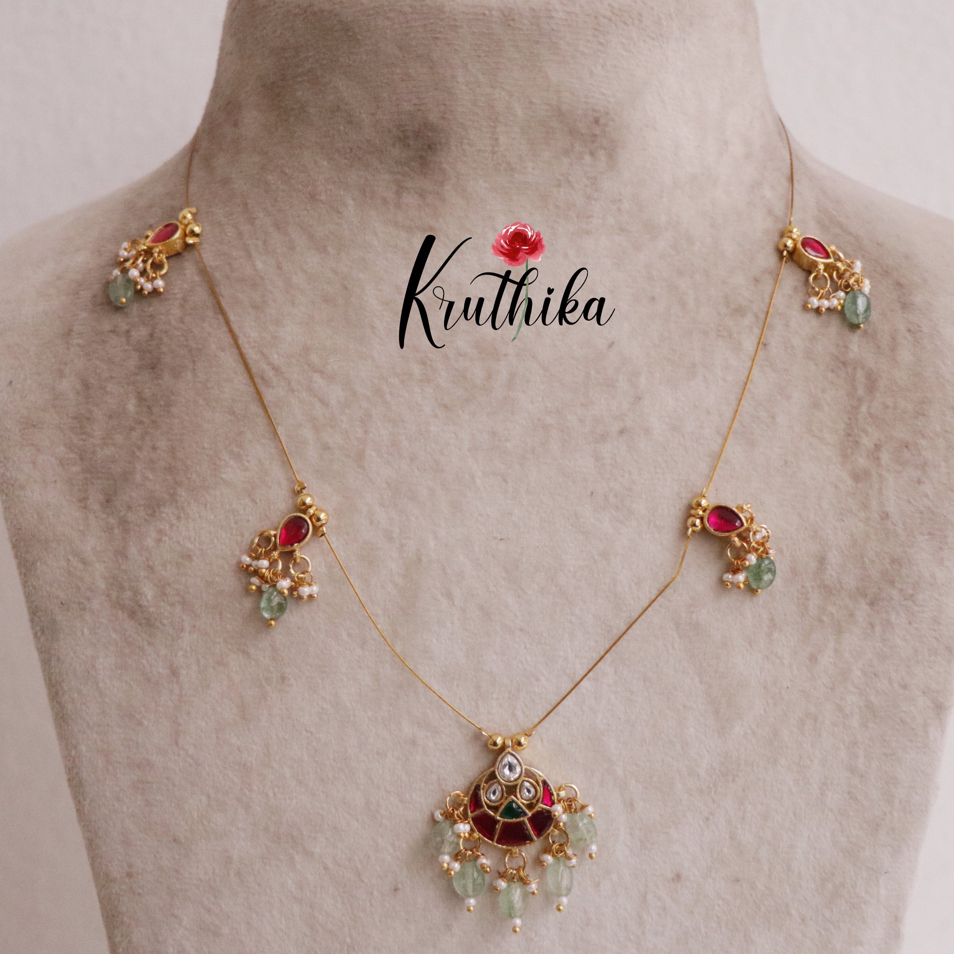 Enhance your style with our stunning, Trendy Moon Design Jadau Muti Stone Pendant with Pastel Green Drops paired perfectly with matching earrings. Crafted with high-quality stones & beads, this set combines timeless elegance with a modern touch. Ideal for special occasions or adding a touch of glamour to your look.