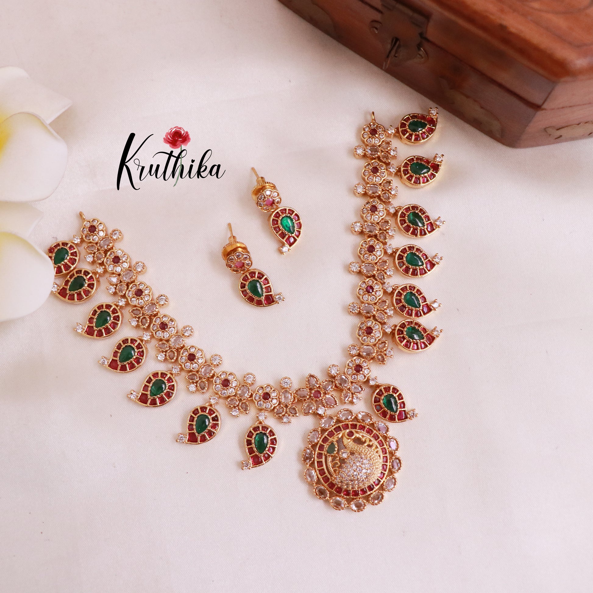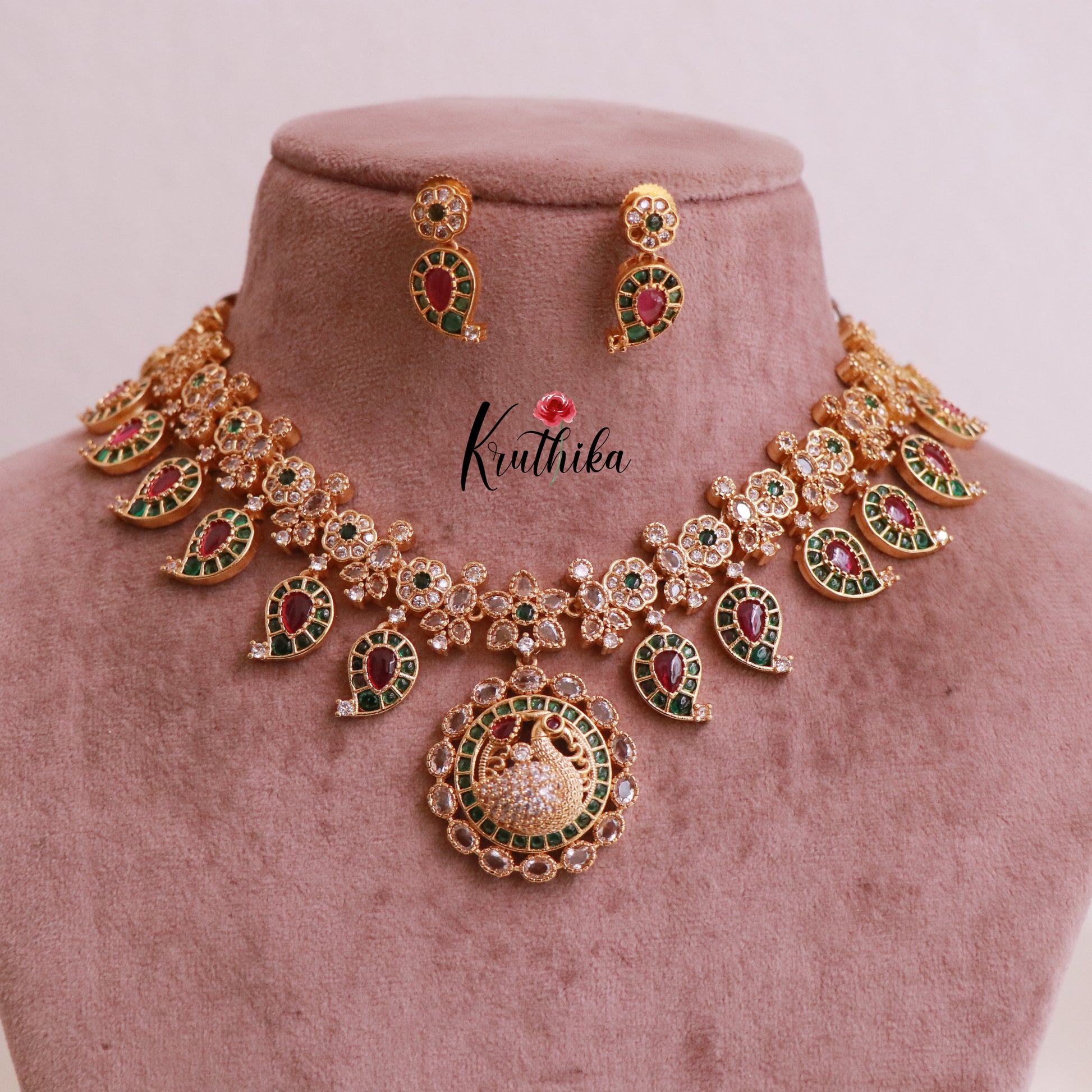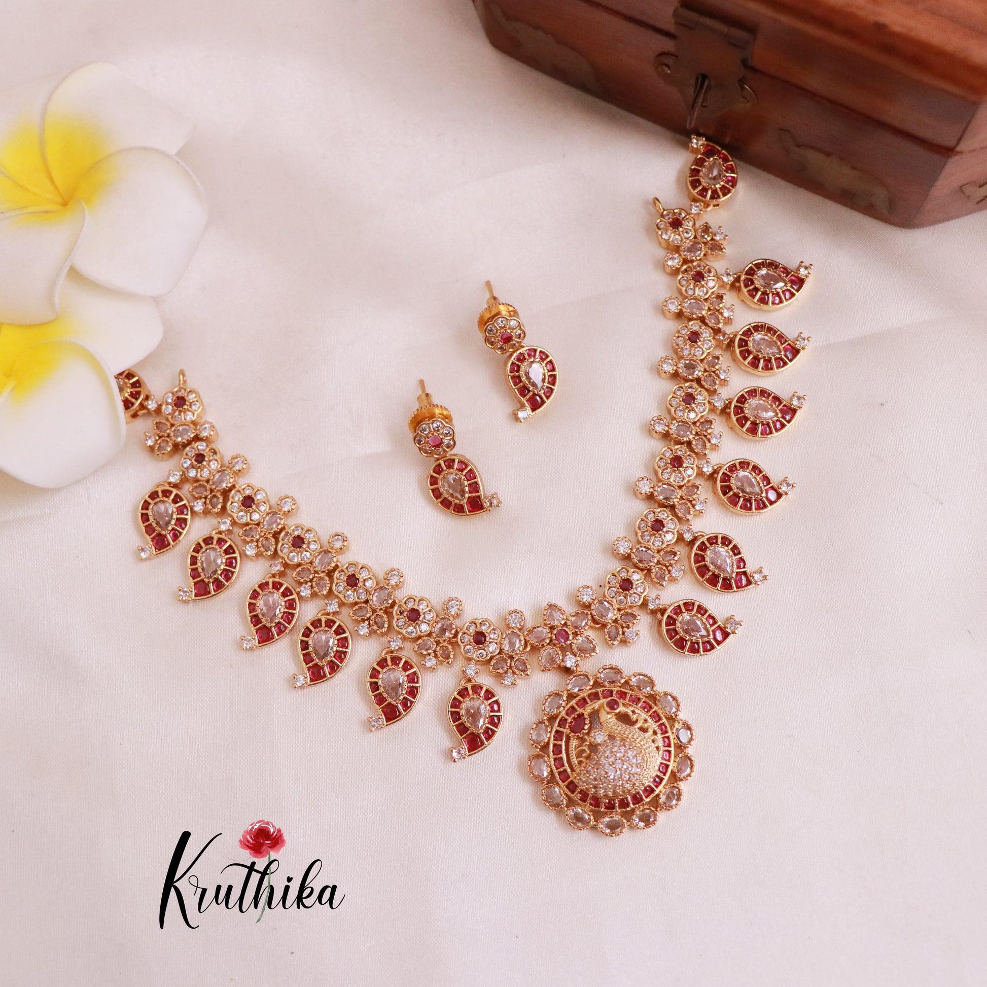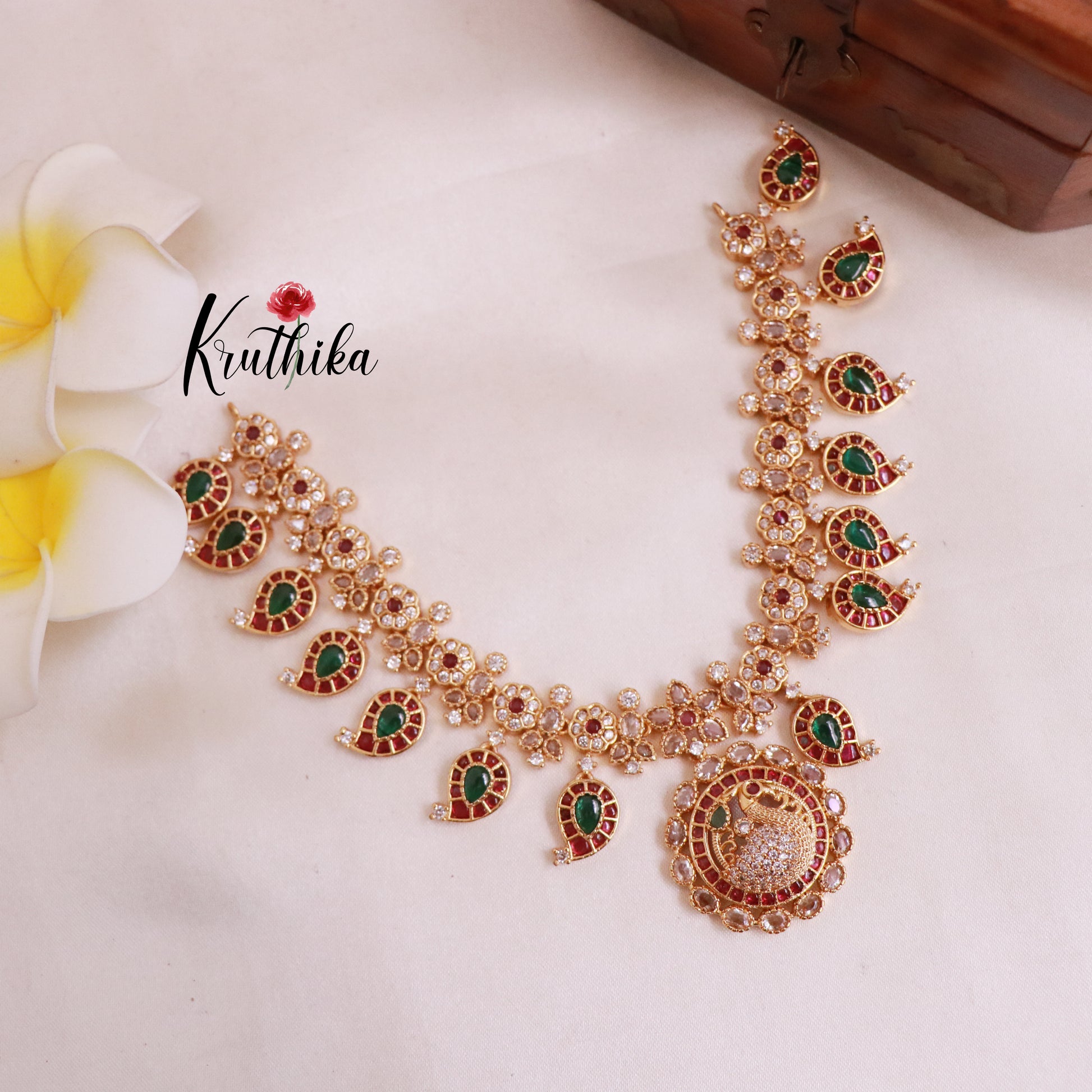Enhance your style with our stunning ,Trendy Peacock Flower Mango Design Crafted with high-quality stones & beads, this set combines timeless elegance with a modern touch. Ideal for special occasions or adding a touch of glamour to your look.
