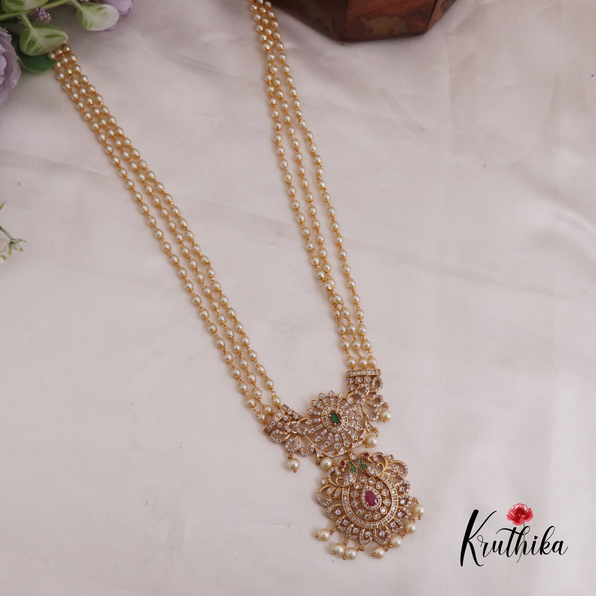Enhance your style with our stunning Trendy Three Layer Pearl Haaram with Peacock Pendant paired perfectly with matching earrings. Crafted with high-quality stones & beads, this set combines timeless elegance with a modern touch. Ideal for special occasions or adding a touch of glamour to your look.