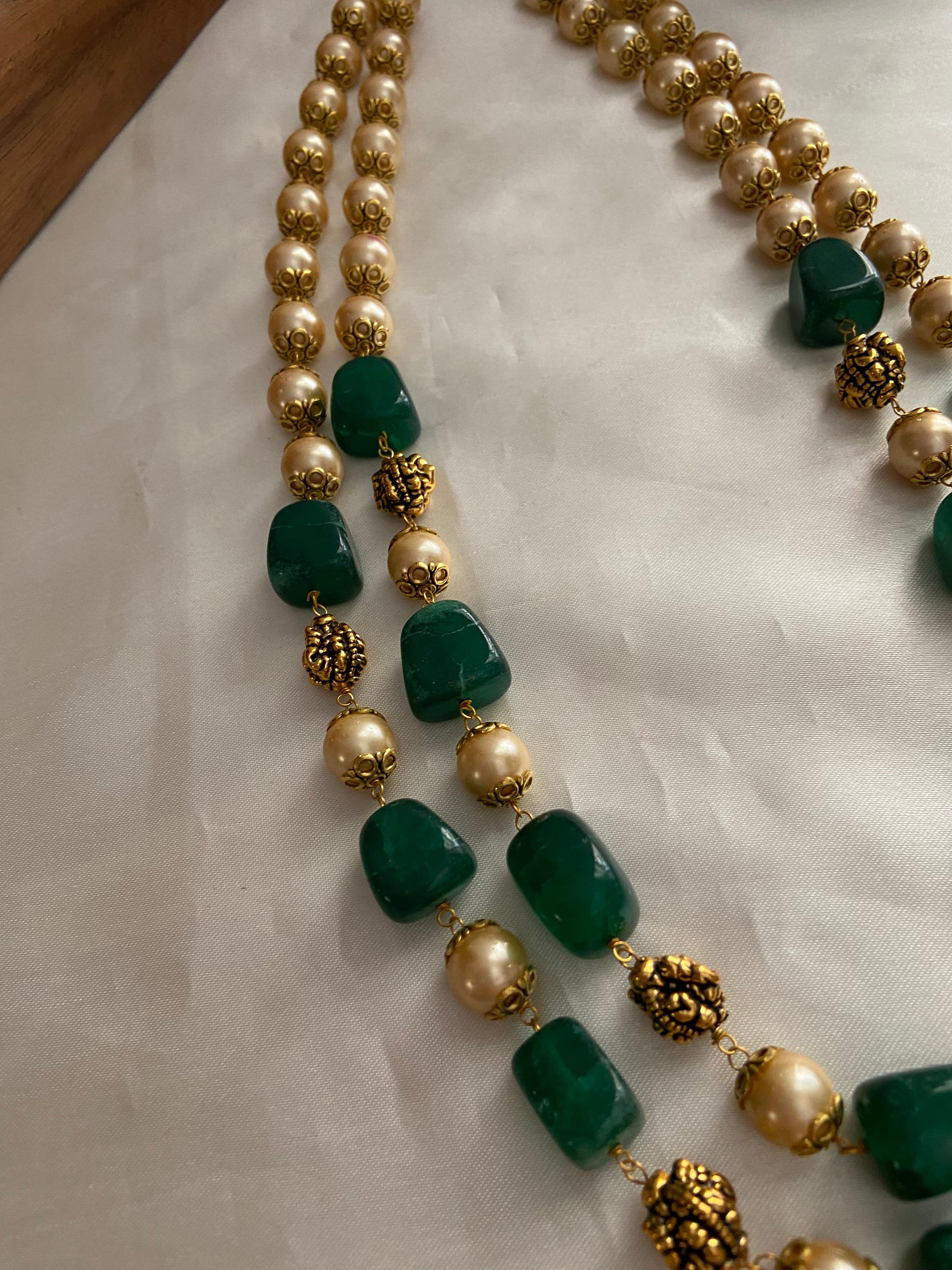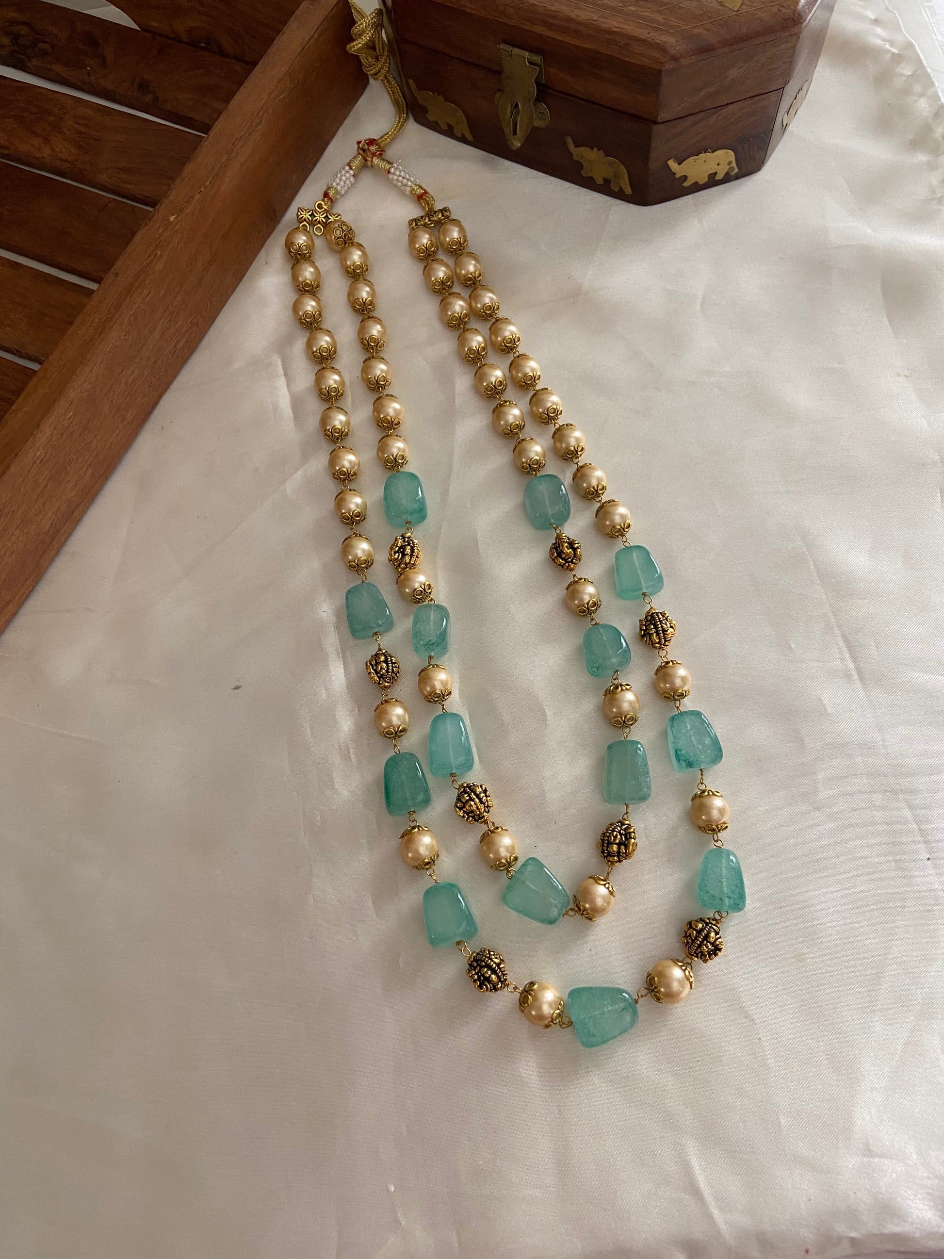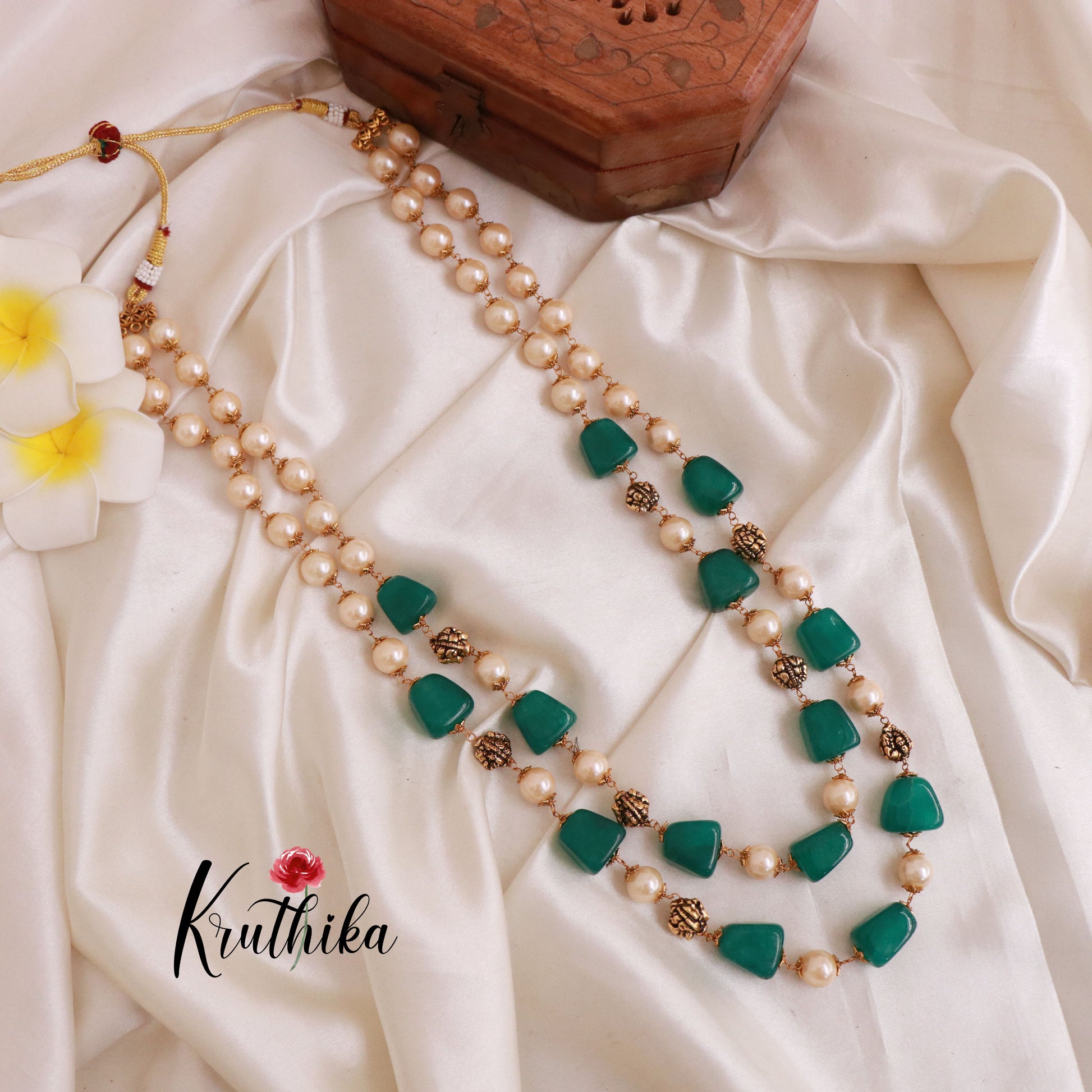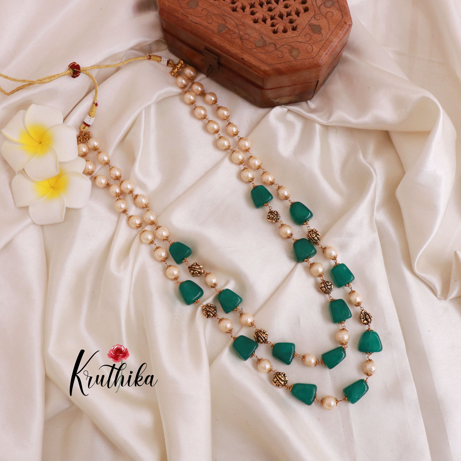 Enhance your style with our stunning Two lines pearls beads maala, paired perfectly with matching earrings. Crafted with high-quality stones & beads, this set combines timeless elegance with a modern touch. Ideal for special occasions or adding a touch of glamour to your look.