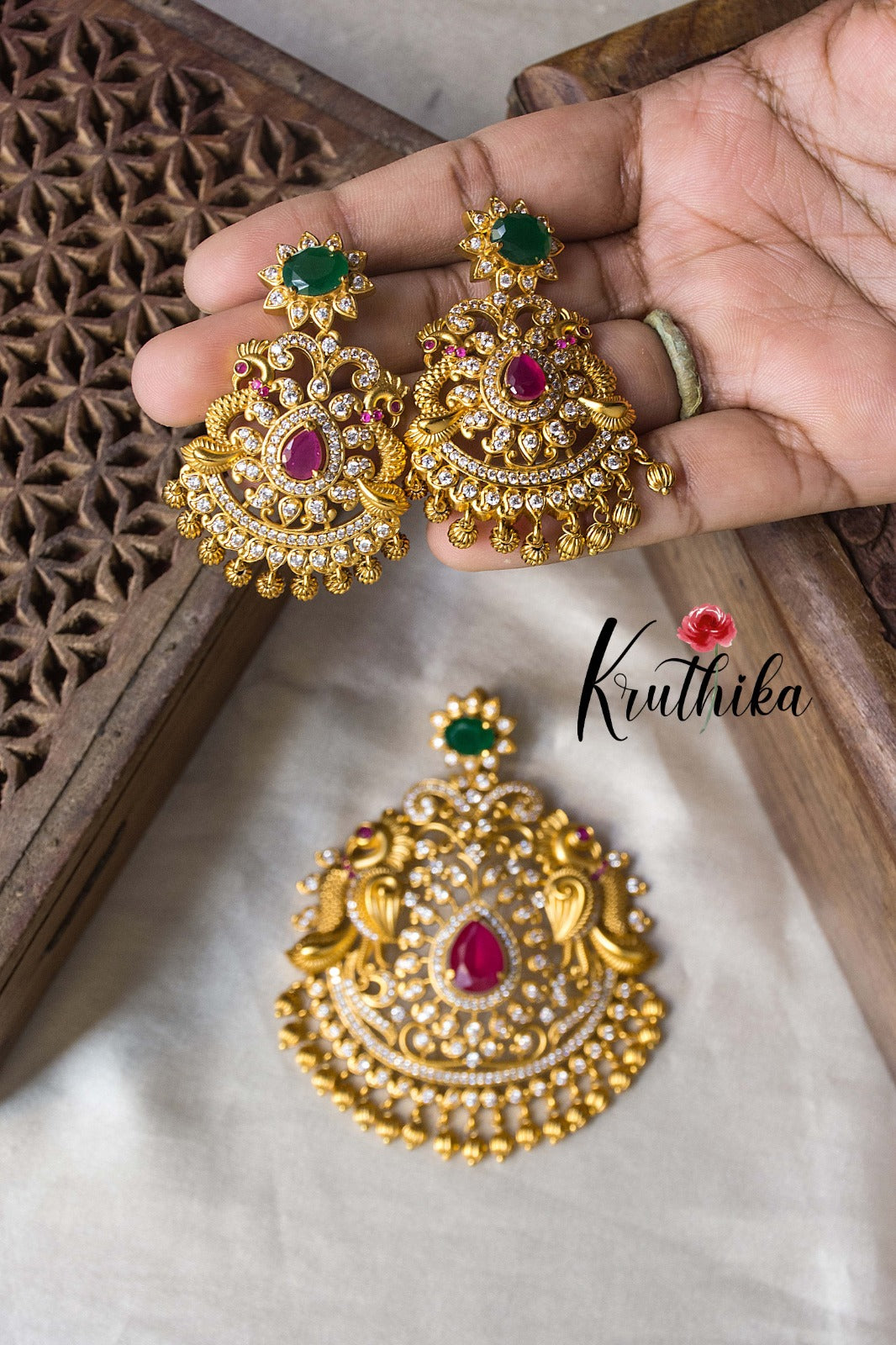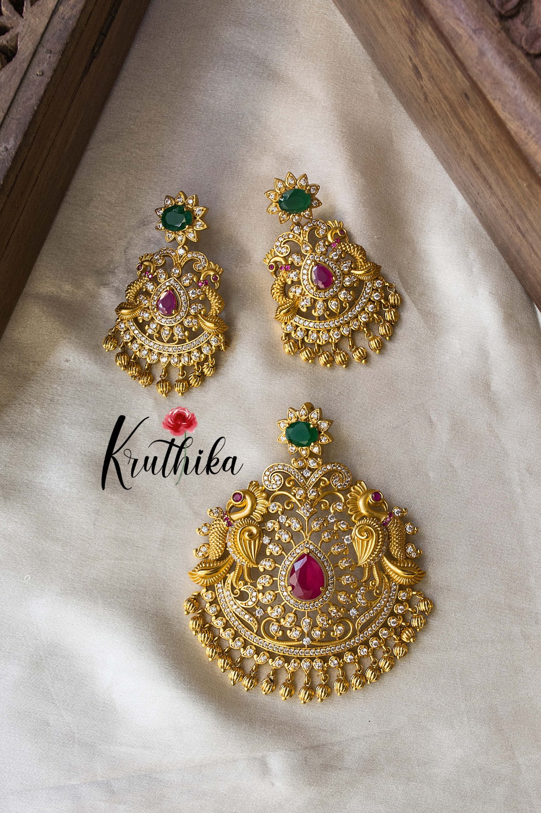 Enhance your style with our stunning AD peacock pendant set, paired perfectly with matching earrings. Crafted with high-quality stones & beads, this set combines timeless elegance with a modern touch. Ideal for special occasions or adding a touch of glamour to your look.